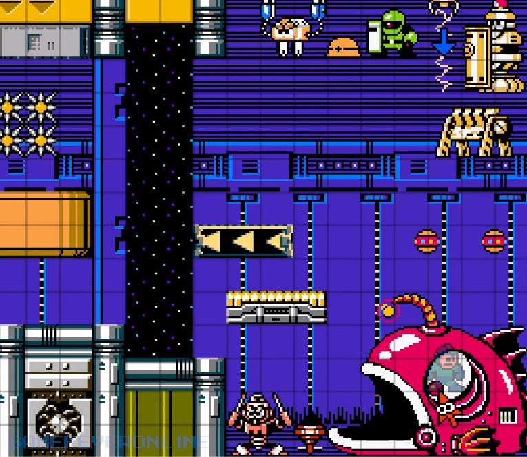We also need to choose the number of types of enemies that will be on a level. I put 5 enemy types in this level, which is the recommended amount. You shouldn’t just put every enemy you can find, you should pick a few and stick to them throughout the level. I chose the Elec’n’, the Met, the Joe Classic, the electric gabyoal, and the oshitsu osarettsu (what a name). Oh, And a fence. An electric one, of course. I also picked the miniboss of the level, which is a fish for some reason. And please never put enemies that can hit you in the first screen of the level and Checkpoint rooms. Doing that doesn’t give the player time to react to what’s happening on screen.