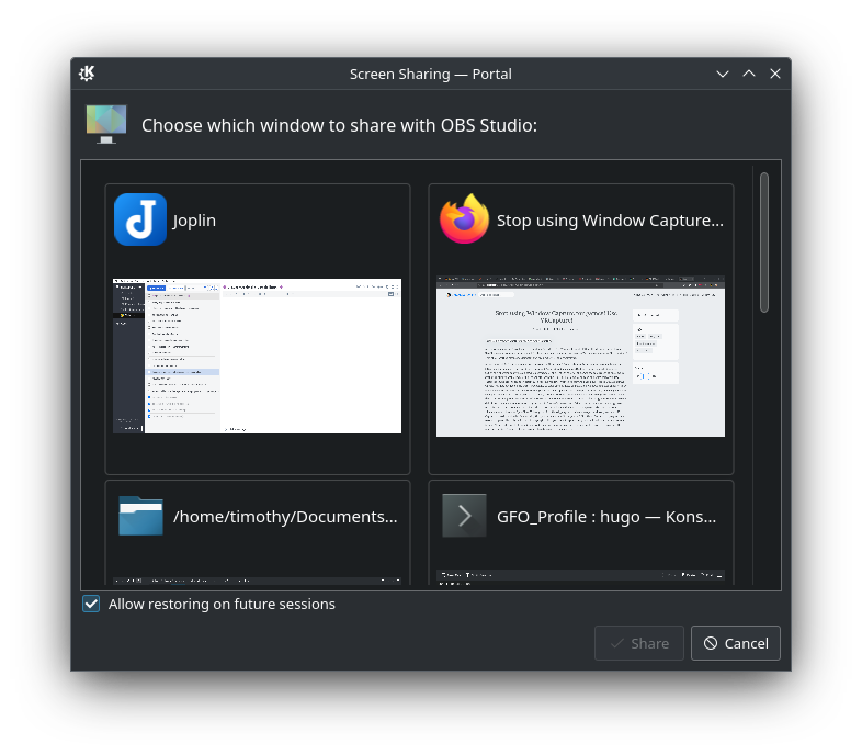 My scenes in OBS Studio were not too complex, but they had a lot of desktop capturing and window captures, the latter being used mainly for recording a windowed game (Mega Man Maker). Desktop capturing worked fine, only requiring a one time confirmation of which screen to capture, but window capture was the sole reason of deciding to stick with X11 for a while. I was using Fedora KDE with the OBS Studio Flatpak, and each one of my many window captures required me to tell the portal which specific window I wanted to capture. Each time I loaded OBS. And if the window was not opened before OBS, I would have to close each of these confirmation windows and then choose one by one the correct windows for each capture. Again, each time I opened OBS.